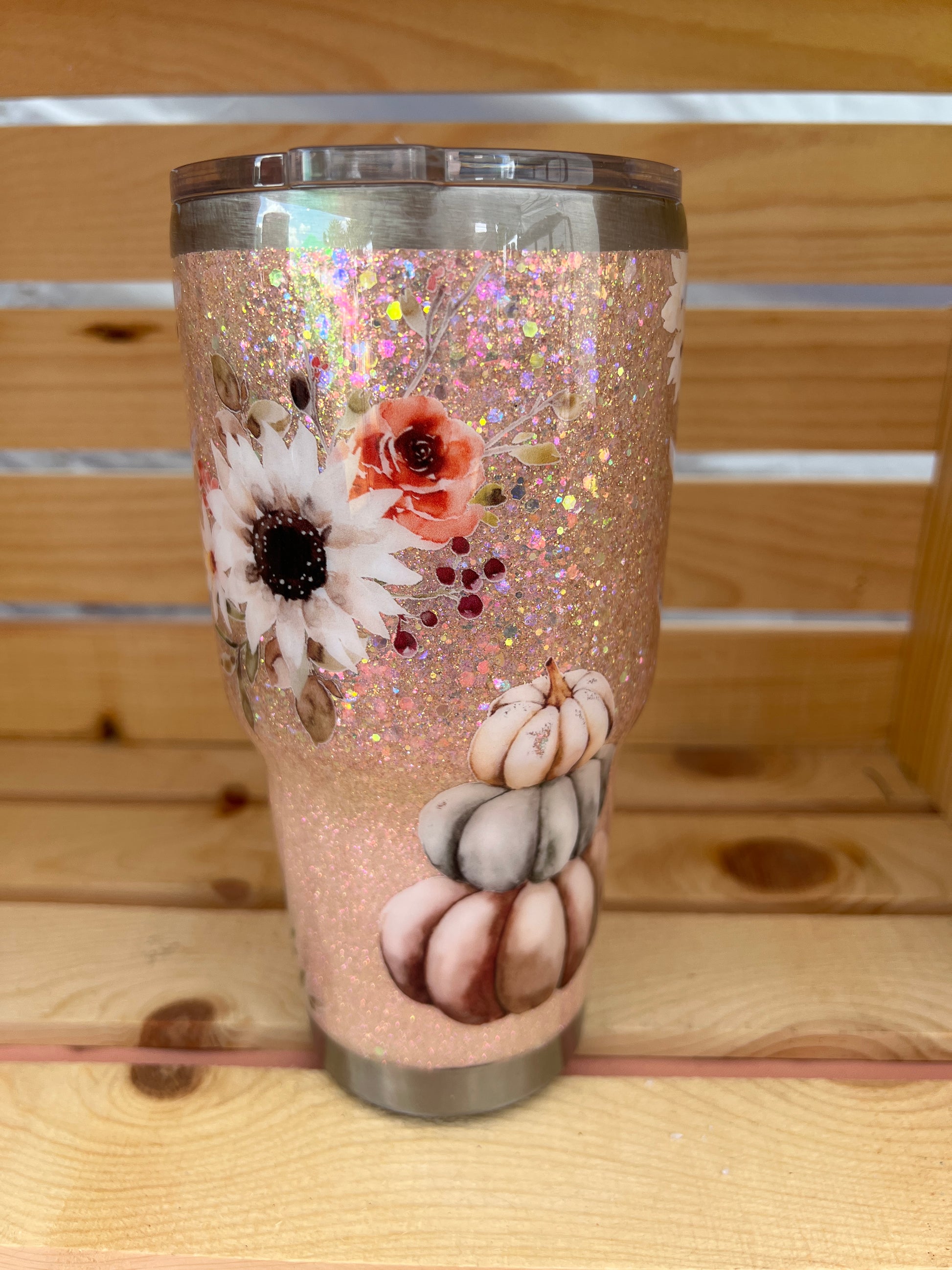 RTS. Fall pumpkin flower peach glitter 30oz modern curve