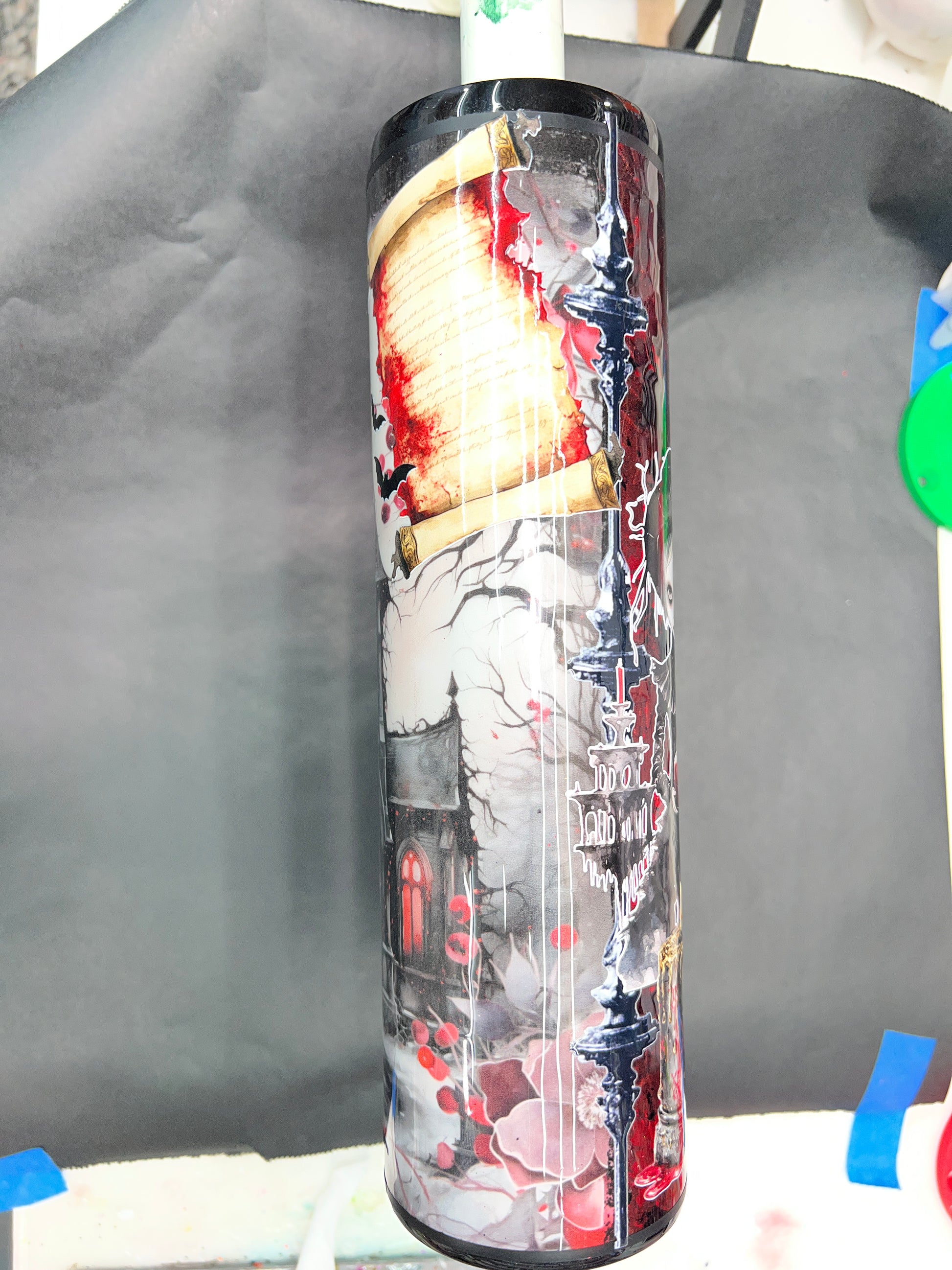 32 oz stainless steel and epoxy tumbler for hot and cold drinks. Comes with lid and straw.