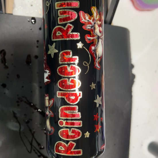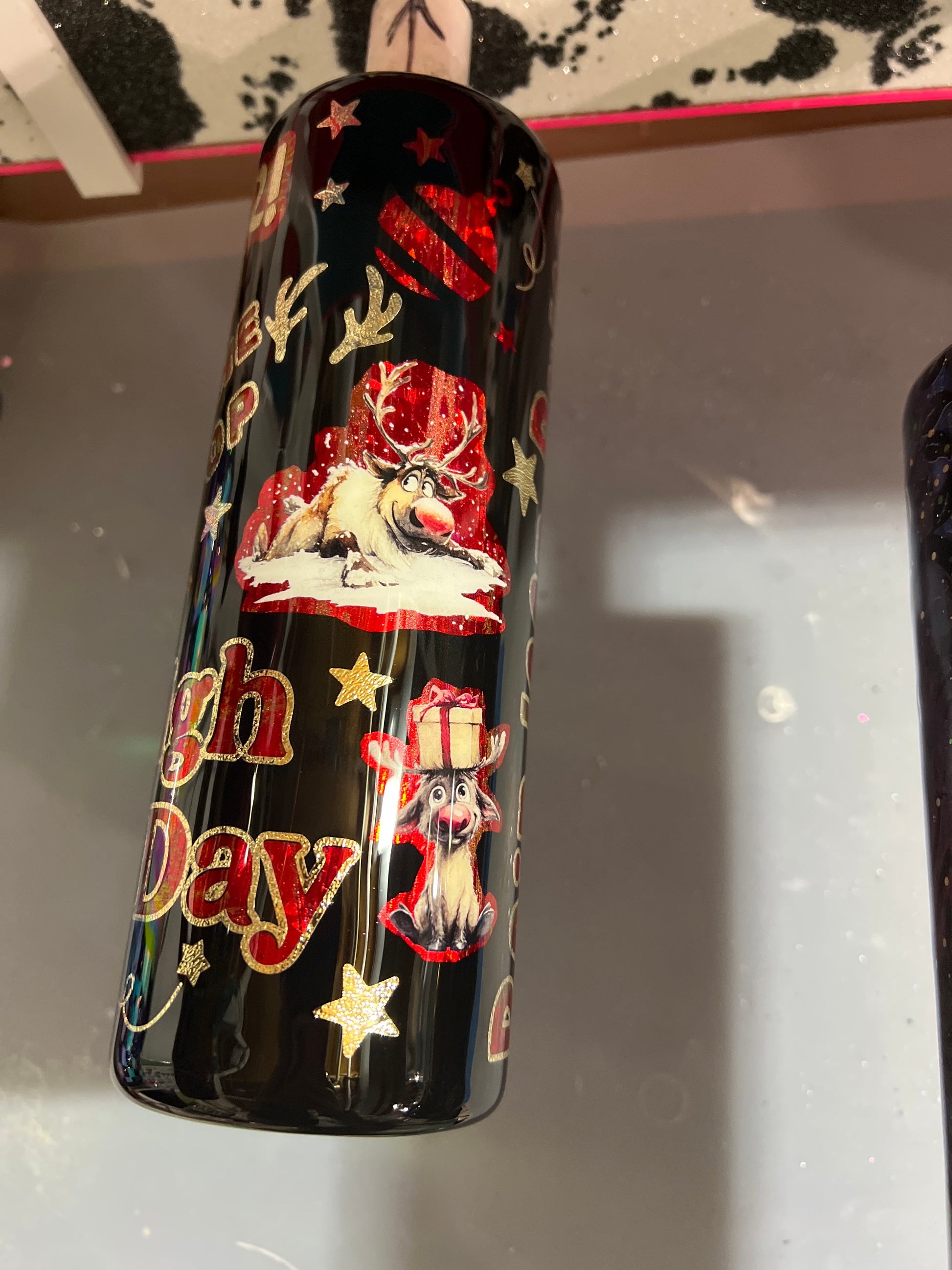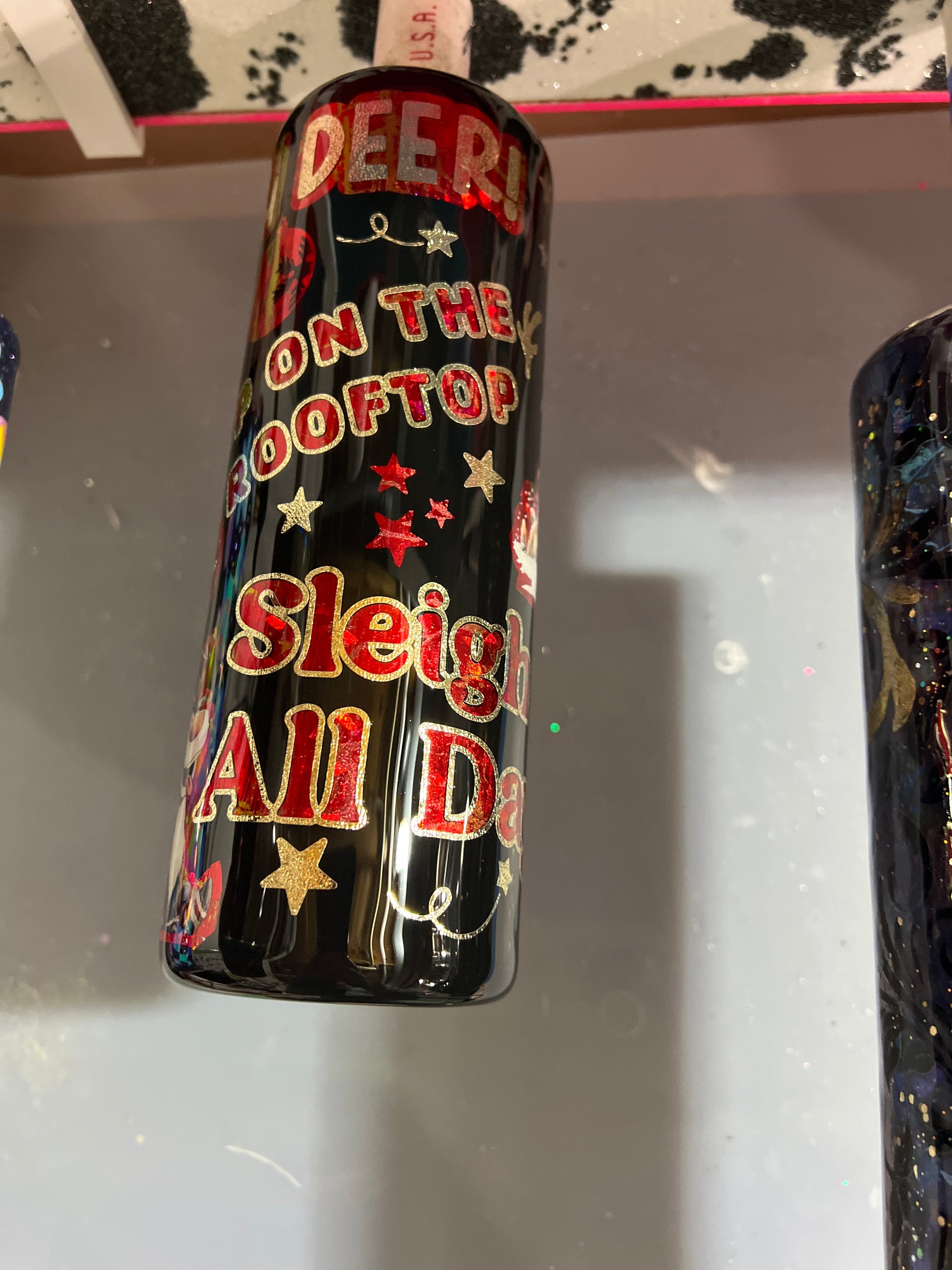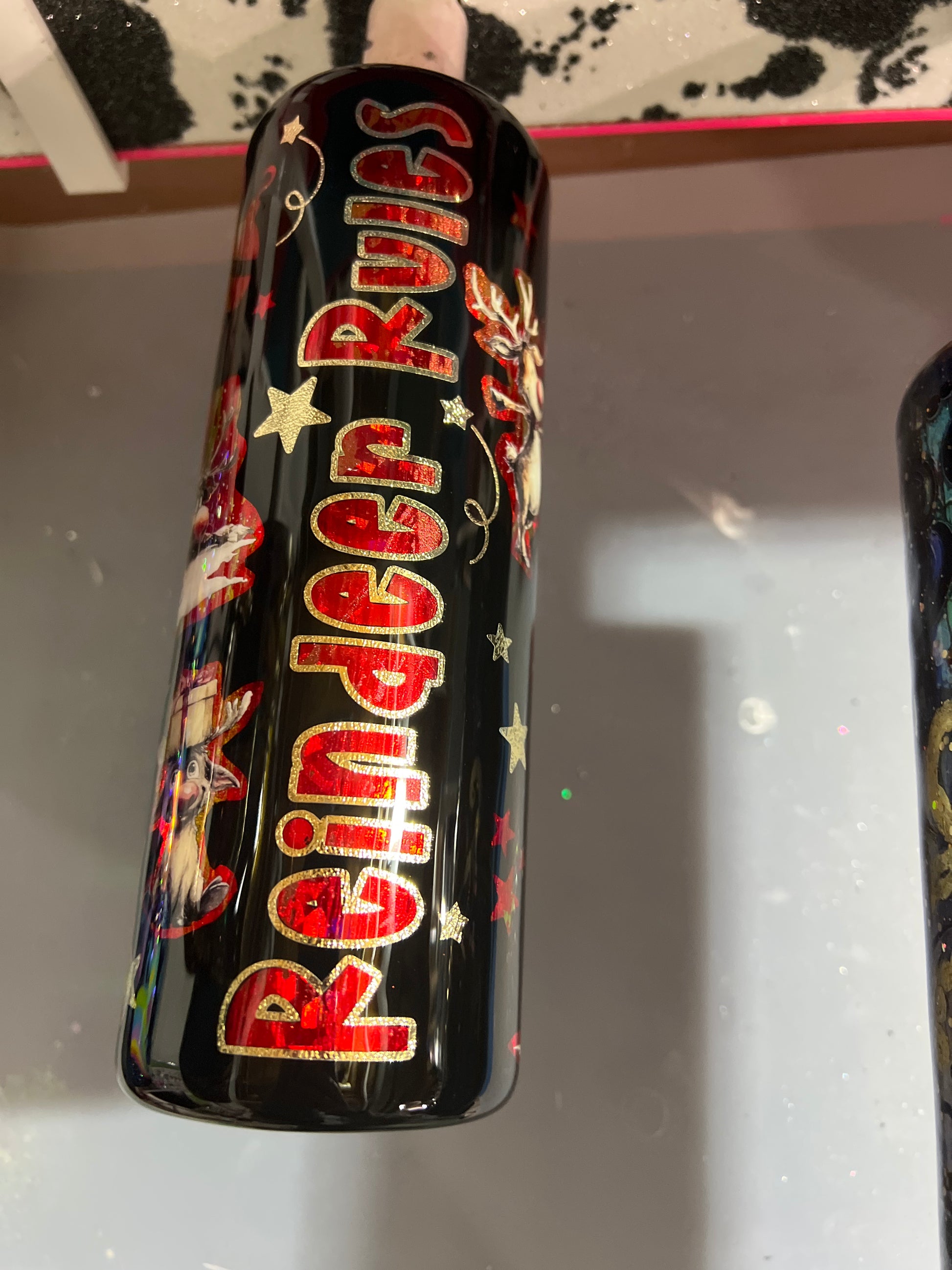 20 oz skinny stainless steel and epoxy tumbler for hot and cold drinks. Comes with lid and straw.