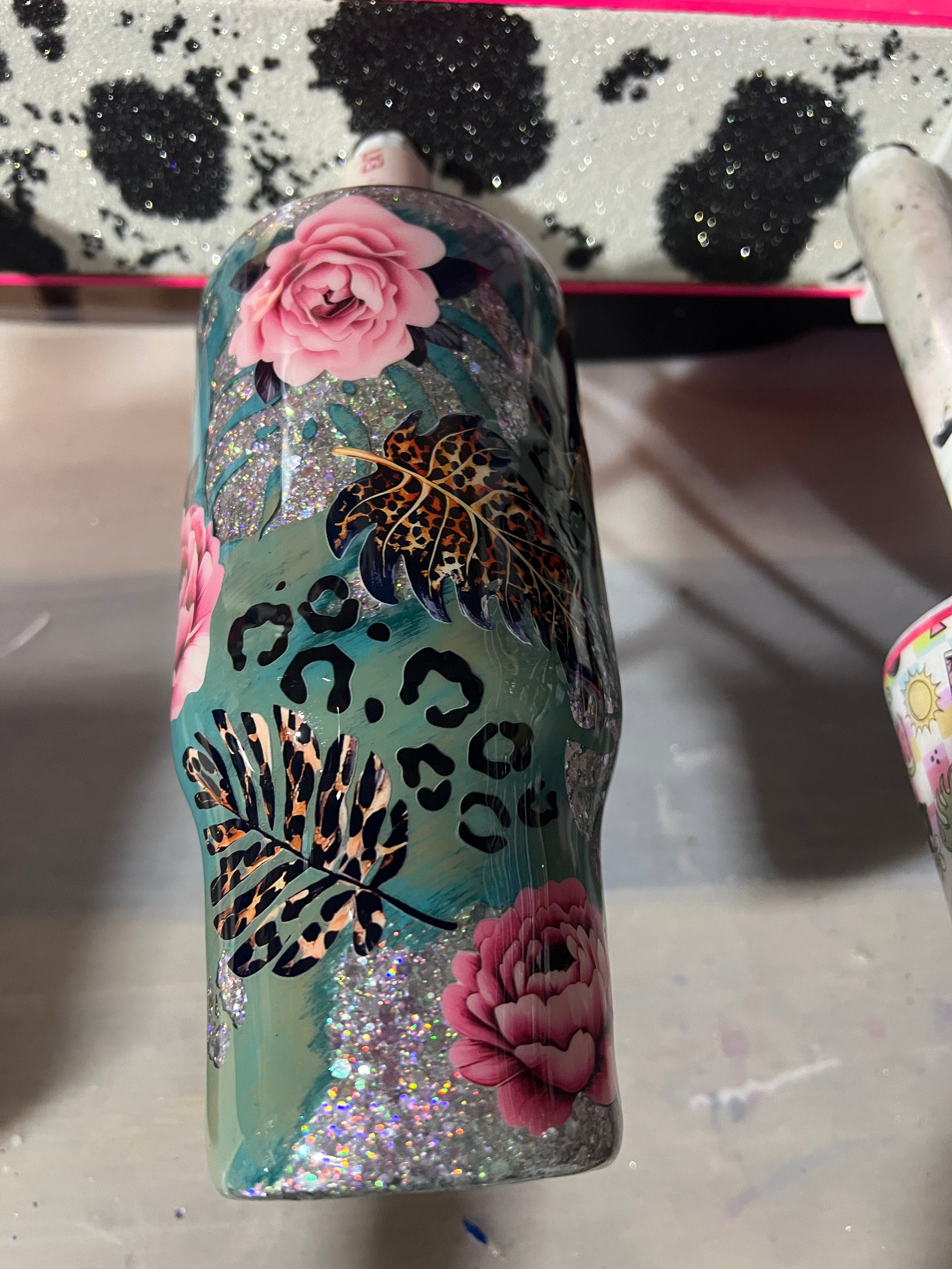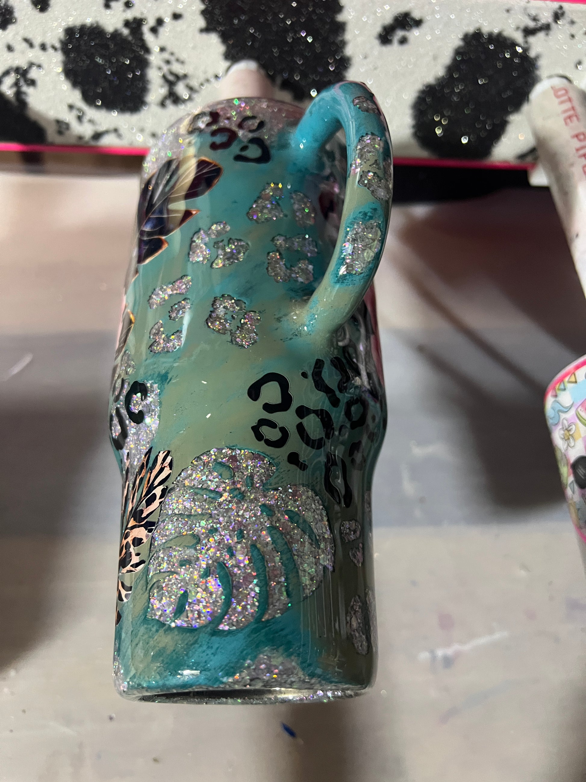 RTS. pink monstera cheetah peekaboo 24oz Tipsy travel mug with Handle
