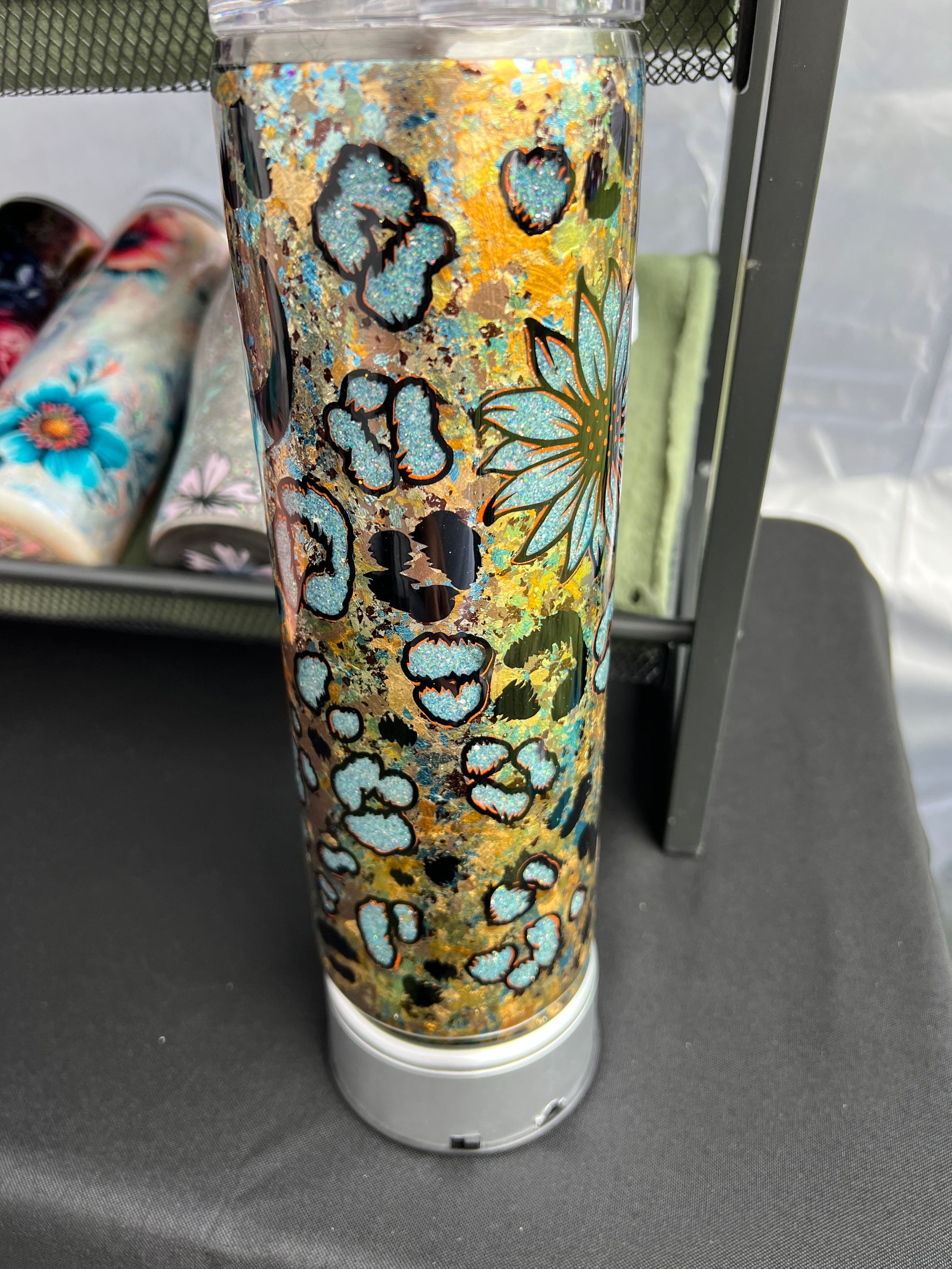 30 oz skinny stainless steel and epoxy tumbler for hot and cold drinks. Comes with lid and straw.
