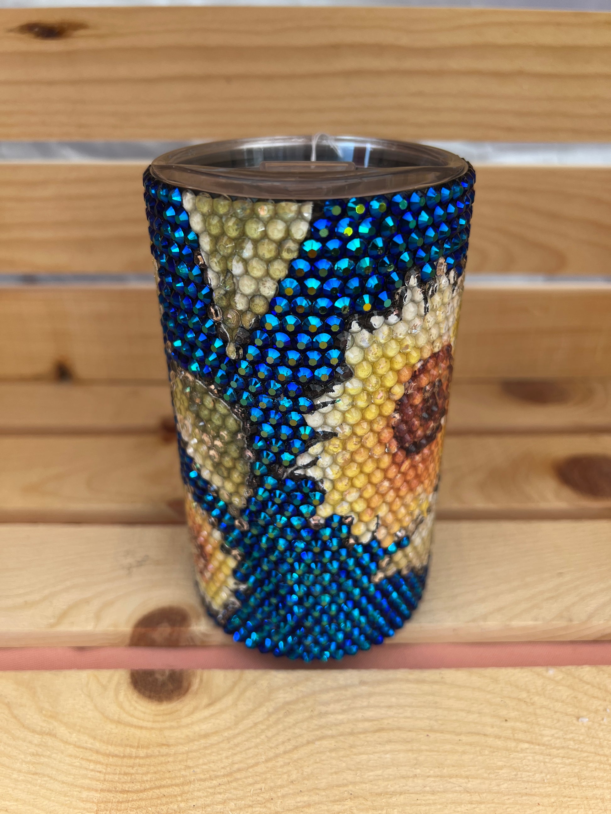 16 oz stainless steel and rhinestone tumbler for hot and cold drinks. Comes with lid.