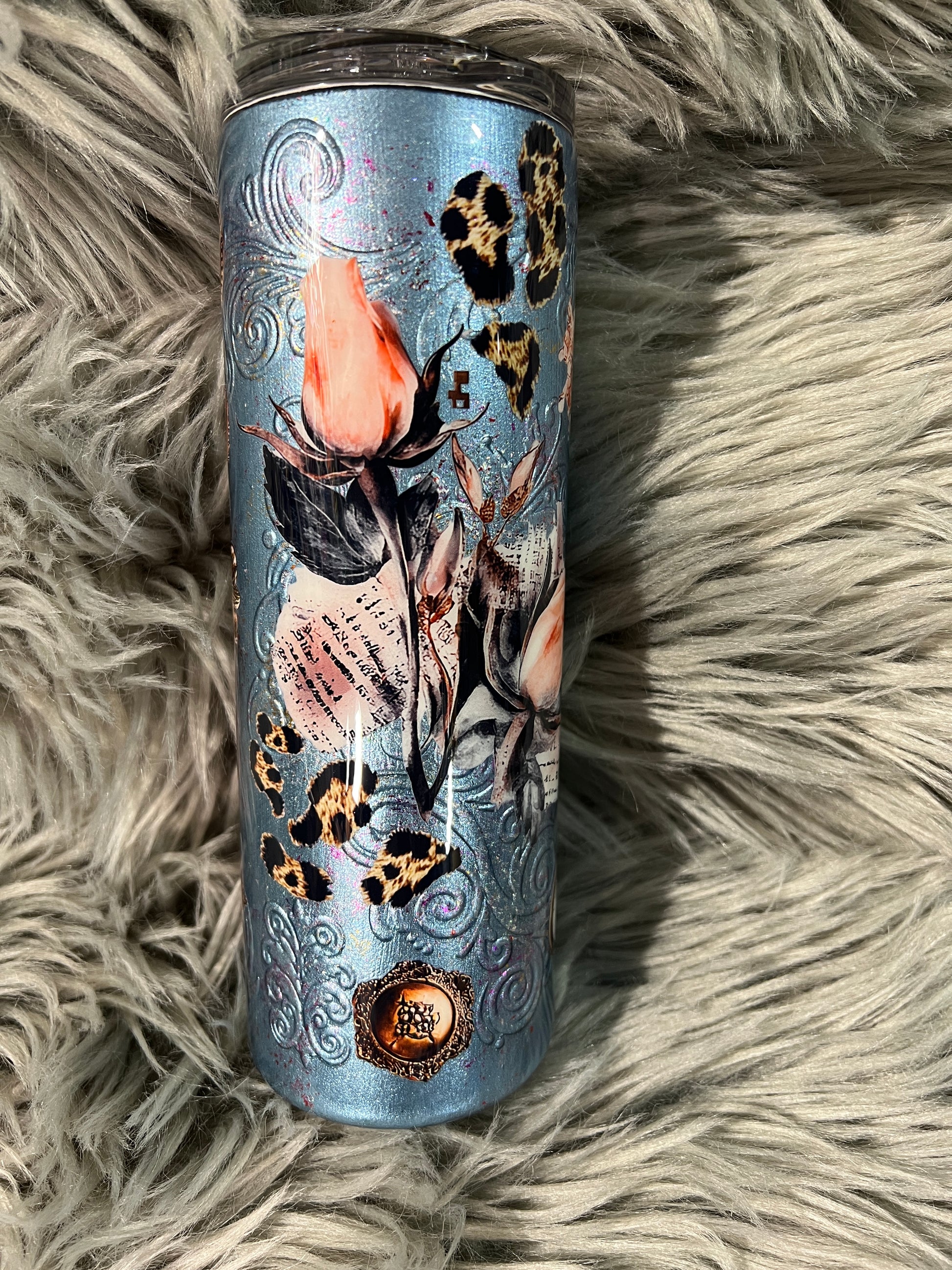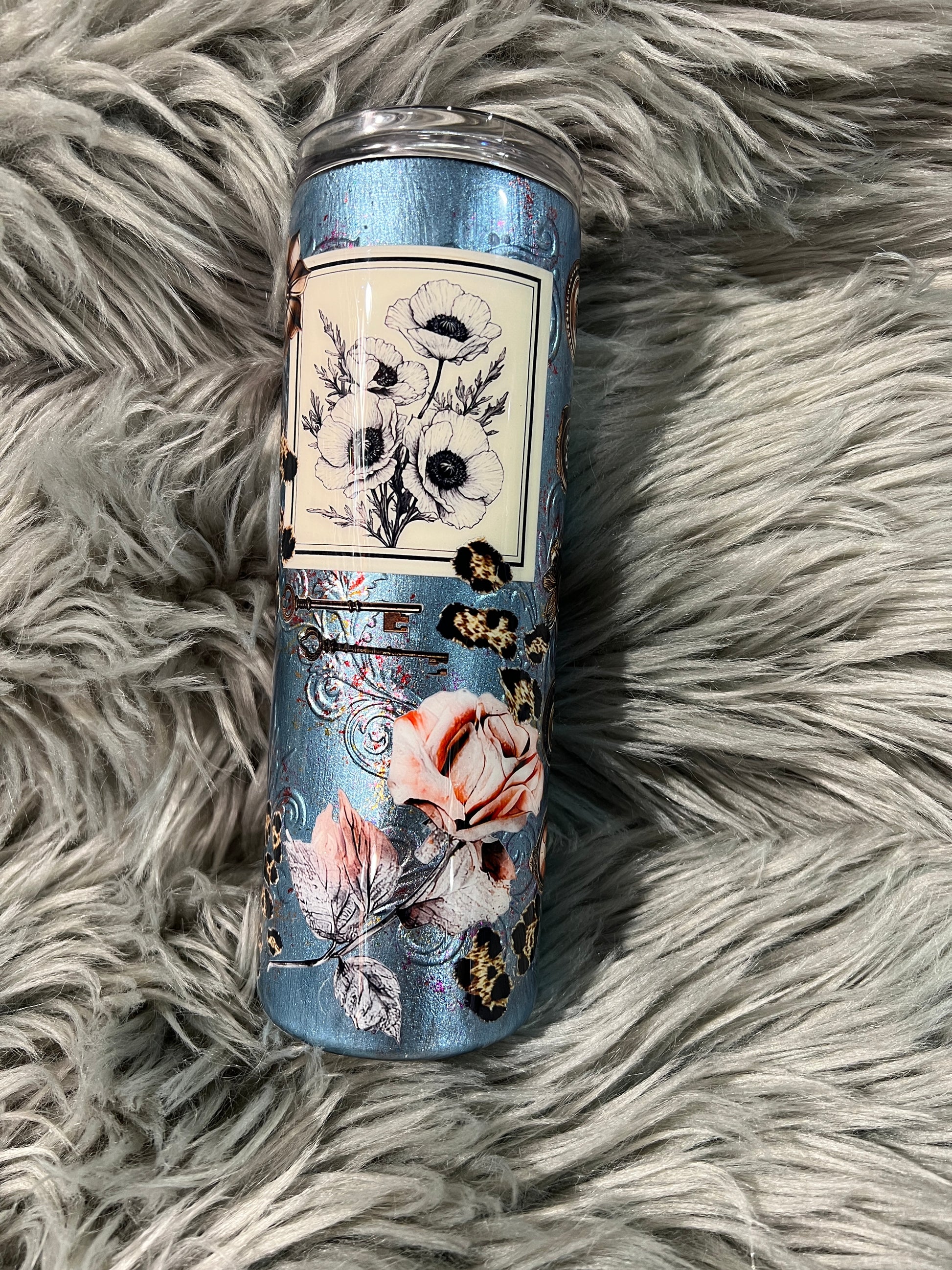 RTS. Antique look Silver blue mica base with scrapbook detailing 20oz