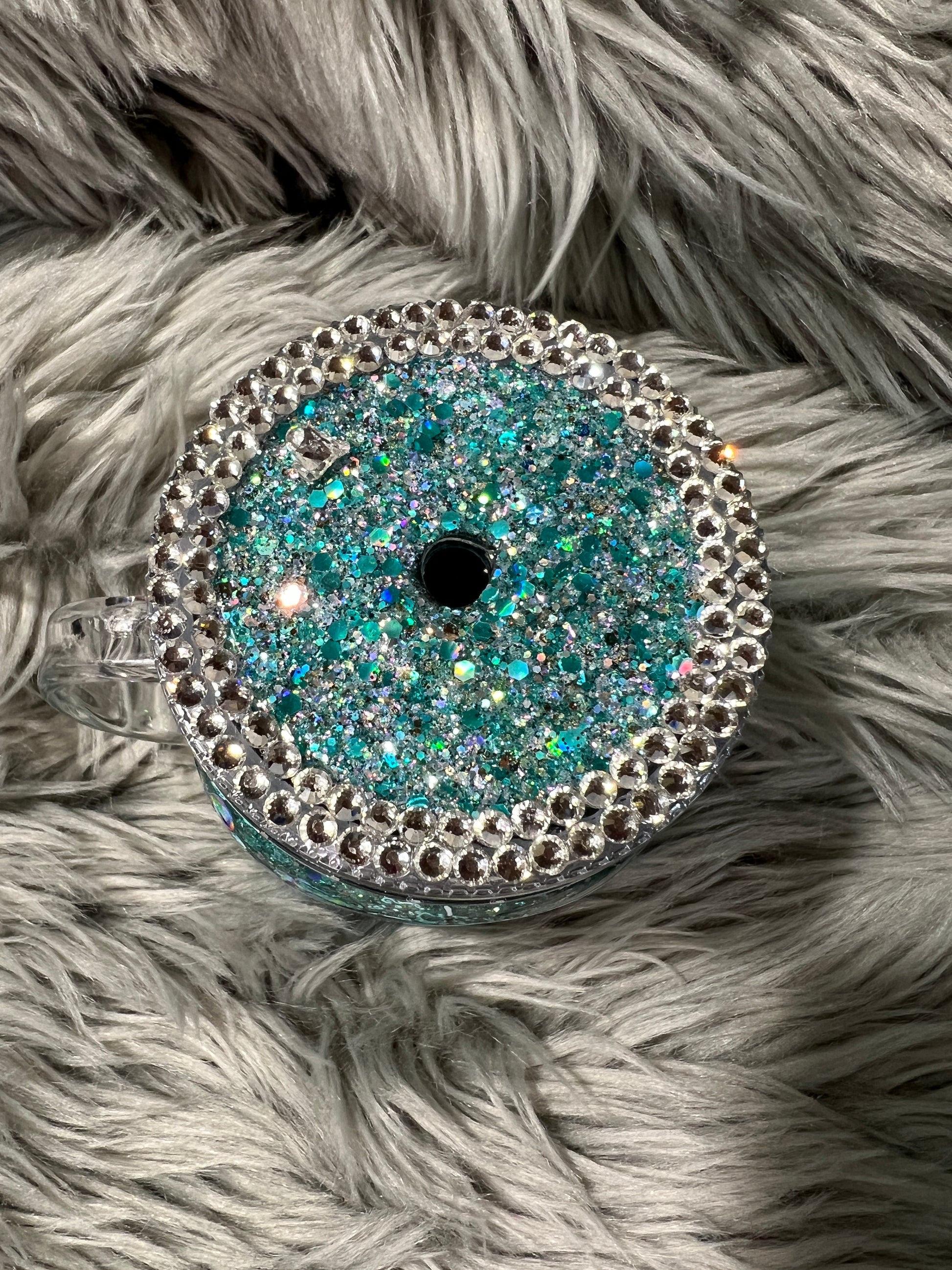 sea turtles on front and back, teal glitter, with glitter and rhinestone lid.